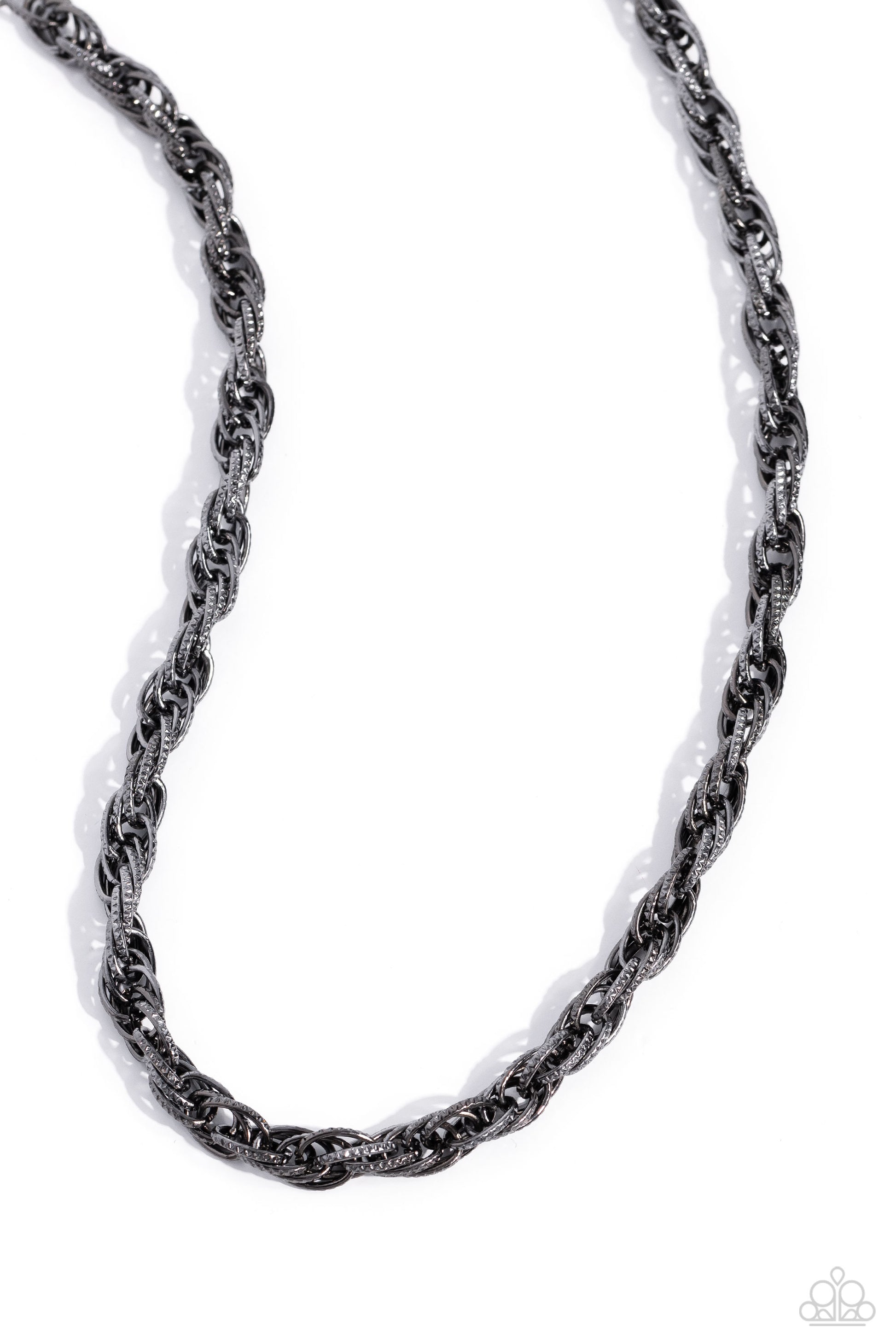 Rings of gunmetal, each embroidered in tactile texture weave into an interconnected braided centerpiece for a monochromatic chic look. Features an adjustable clasp closure.