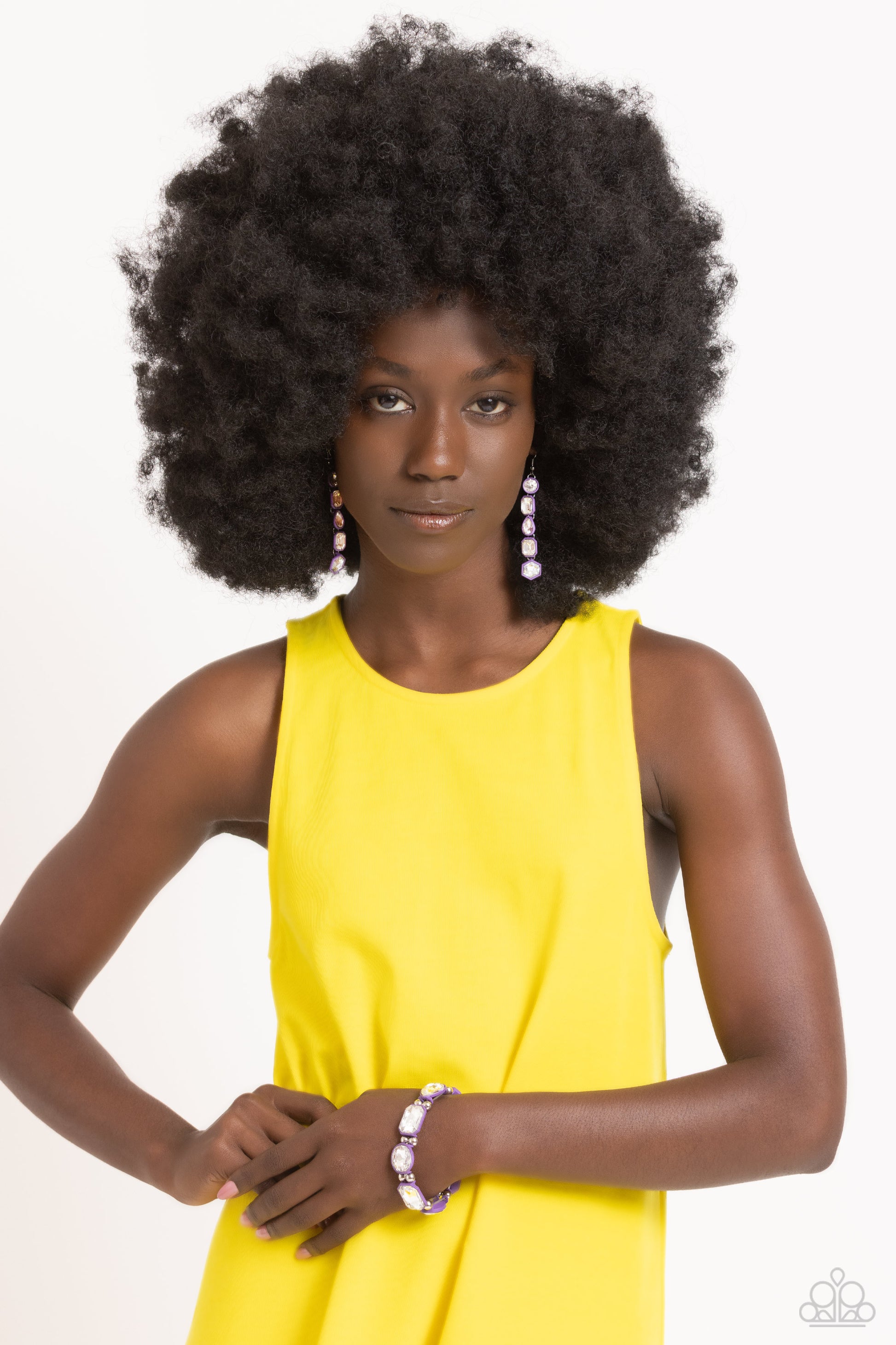 Featuring purple rubber-like frames, a glassy collection of white round, teardrop, hexagonal, and emerald-cut gems trickle from the ear for a shoulder-dusting fashion. Earring attaches to a standard fishhook fitting.