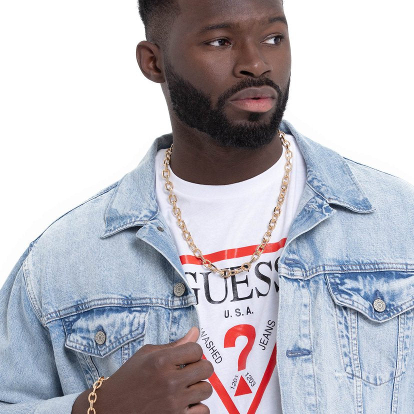 Textured gold hoops and angular oval gold links boldly connect across the chest, resulting in an intense industrial statement piece. Features an adjustable clasp closure.