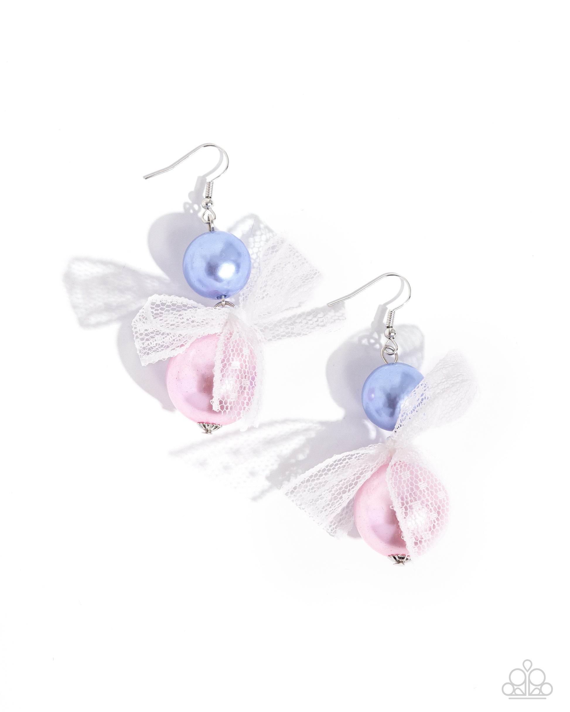Two glossy pearls one in blue and one in pink stack atop one another while an airy, chiffon white ribbon is tied in the center of the pearls for a refined finish. Earring attaches to a standard fishhook fitting.