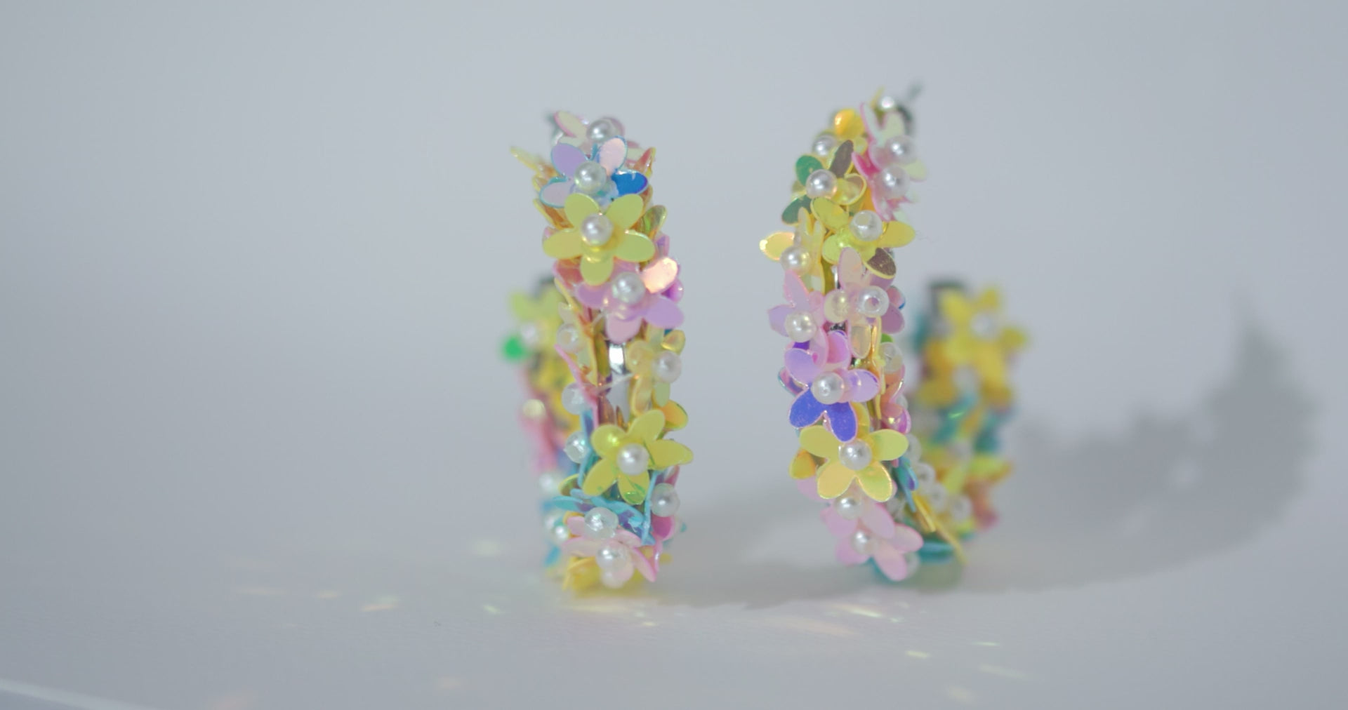 A floral explosion, encompassing the entirety of a thick silver hoop, features reflective light blue, pink, and yellow flowers dotted with dainty pearl centers for a dreamy, whimsicality below the ear. Earring attaches to a standard post fitting. Hoop measures approzimately 1 1/2" in diameter.