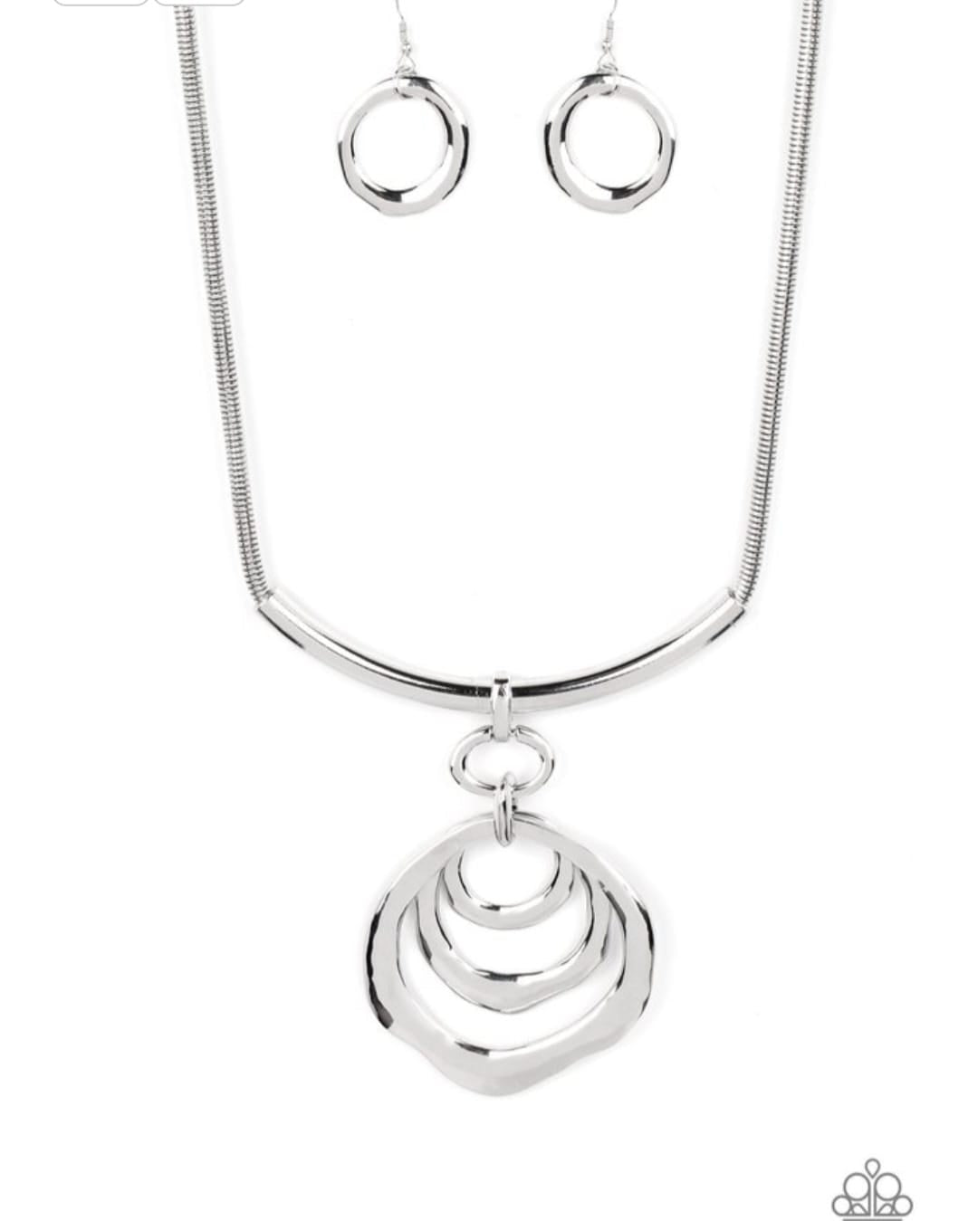 Warped silver hoops glisten from the bottom of a bowing silver bar set in the center of a rounded silver snake chain, resulting in a contemporary centerpiece below the collar. Features an adjustable clasp closure.