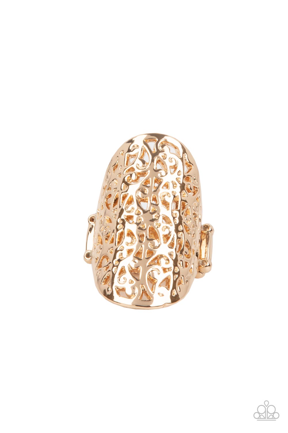 Stenciled in airy filigree patterns, a shiny gold oval delicately folds around the finger for a seasonal inspired finish. Features a stretchy band for a flexible fit.