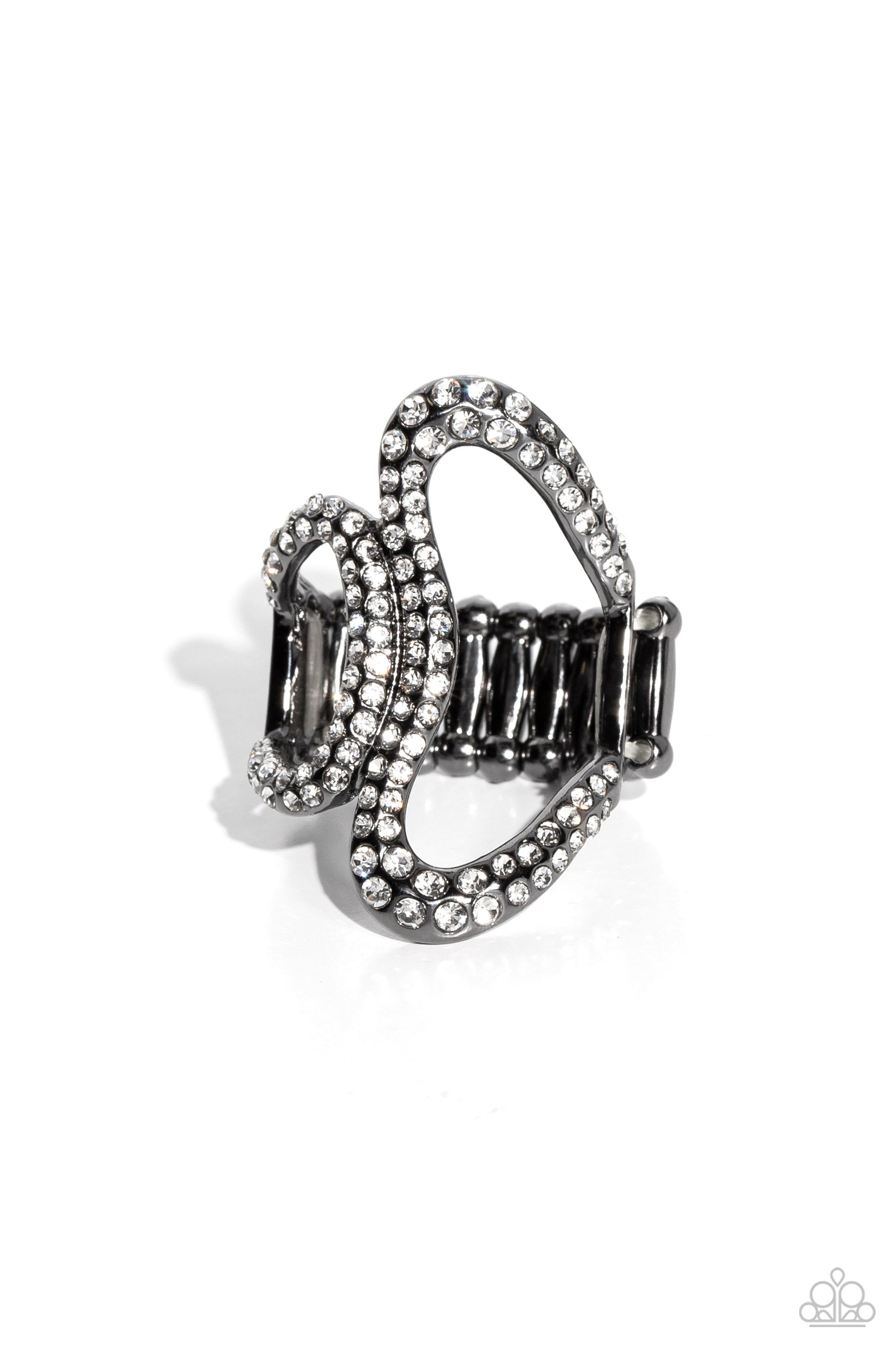 Glistening gunmetal bars asymmetrically curl across the finger, joining into an airy centerpiece for a minimalist-inspired look. Encrusted along the curves of each gunmetal bar, two rows of dainty white rhinestones shimmer and shine for a refined finish. Features a stretchy band for a flexible fit.