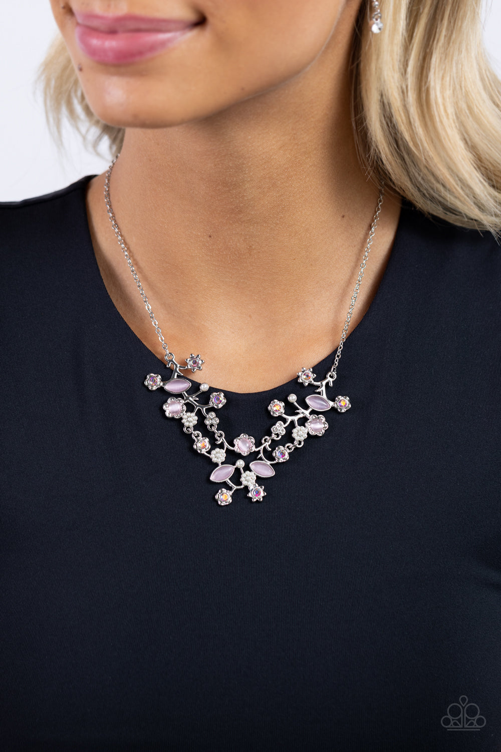 Round and marquise-cut pink cat's eye stones, pink iridescent rhinestones, and dainty white pearls are pressed in flowering and vine-like clustered frames, creating a whimsical display across the collar. Features an adjustable clasp closure. Due to its prismatic palette, color may vary.