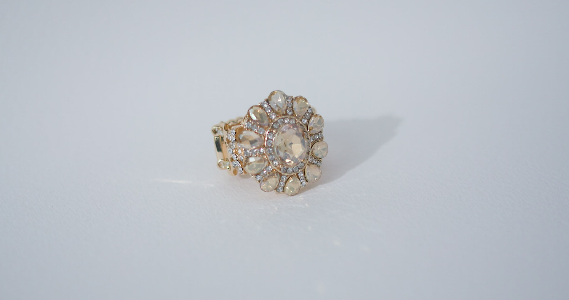 Bordered by dainty white rhinestones, glassy champagne teardrop gems bloom around an exaggerated oval-cut champagne center, creating an enchanting, ornate, gold floral centerpiece atop the finger. Features a stretchy band for a flexible fit.
