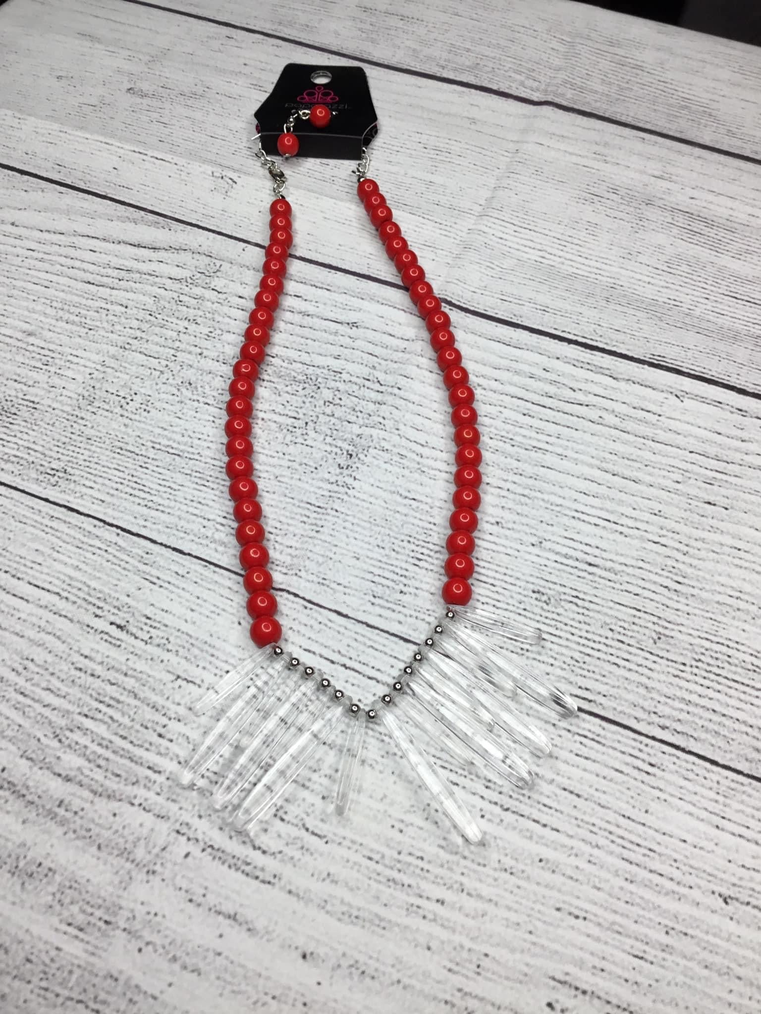 Acrylic icicles drip from the center of a strand of red beads, creating an intensely icy fringe below the collar. Features an adjustable clasp closure.