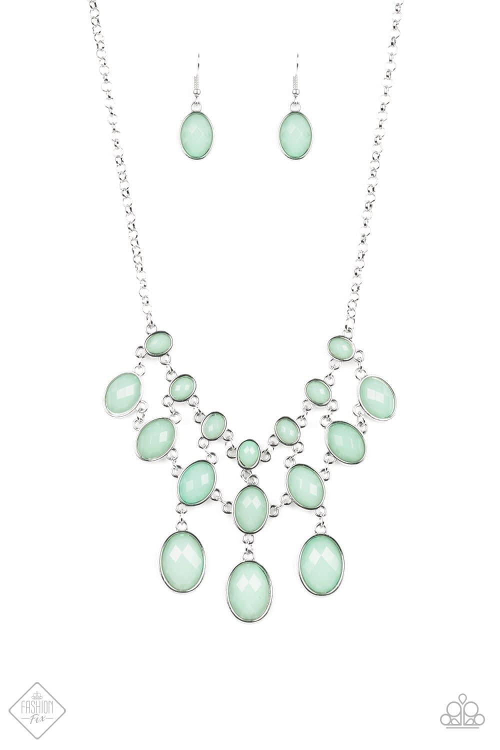 Gradually increasing in size as they cascade down the chest, rows of opalescent Spearmint gems link together below the collar in a glamorous netted fringe. Features an adjustable clasp closure.