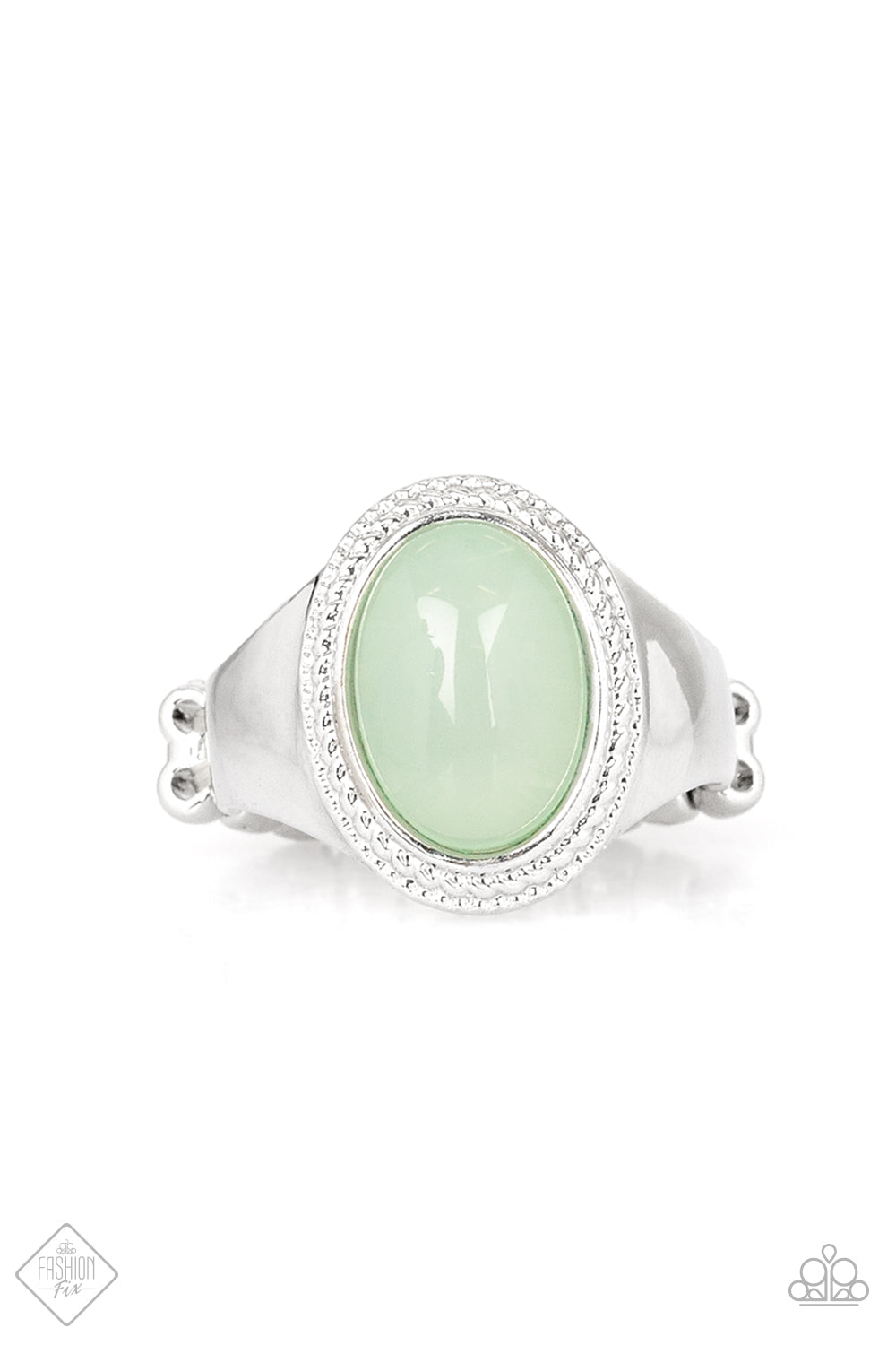 An opalescent Spearmint bead is pressed into the center of a dainty silver band radiating with studded silver textures for a whimsical look. Features a dainty stretchy band for a flexible fit.