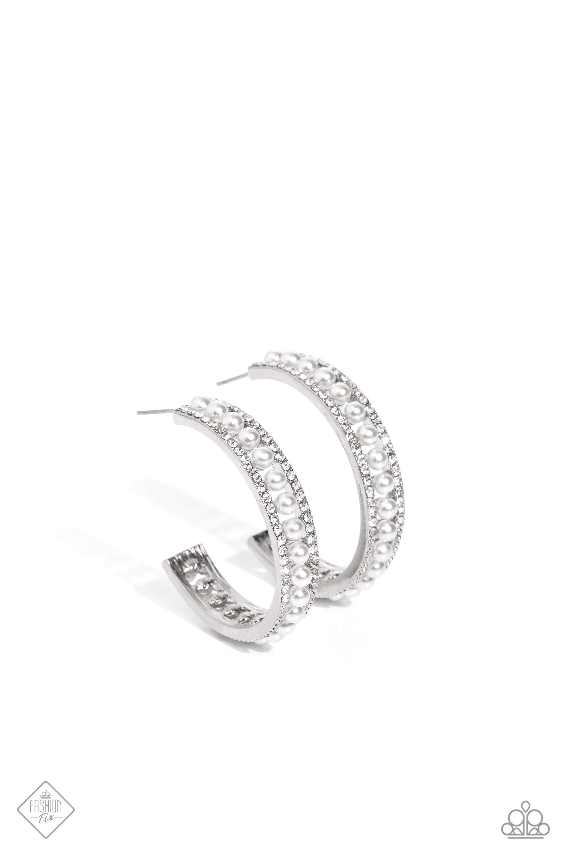 A row of dainty white pearls seemingly floats between rhinestone-encrusted bands of silver, as they curl around the ear to create an elegant hoop. Earring attaches to a standard post fitting. Hoop measures approzimately 1 1/2" in diameter.