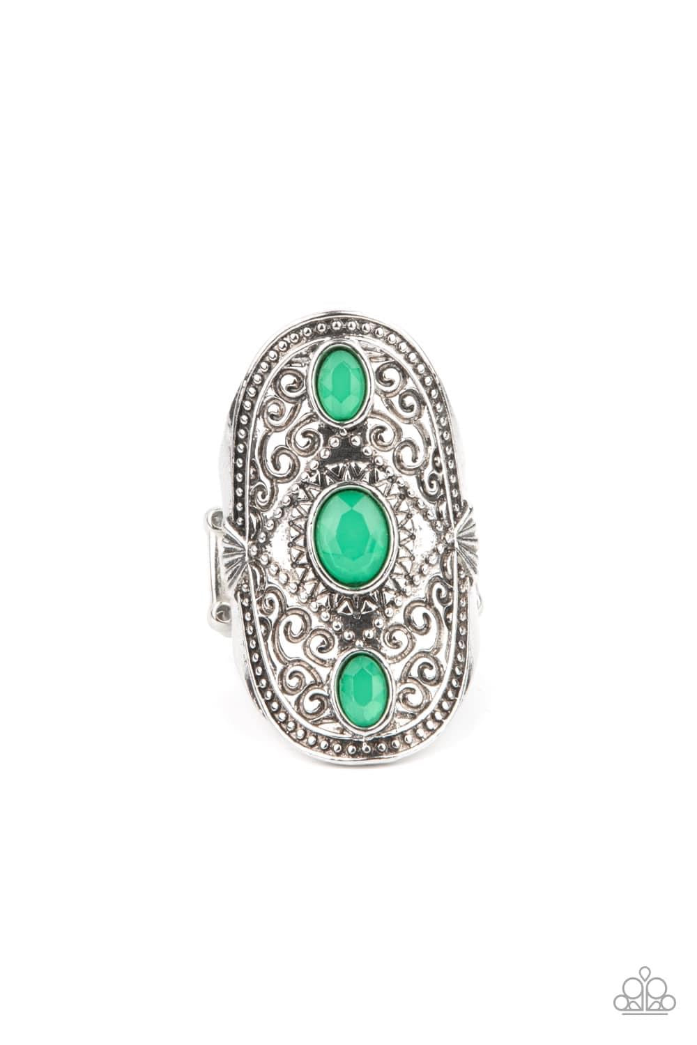 A trio of opaque Mint oval beads encased in silver frames graces the top of an elaborately decorated silver band. Dotted texture and floral designs create a statement-making finish atop the finger. Features a stretchy band for a flexible fit.