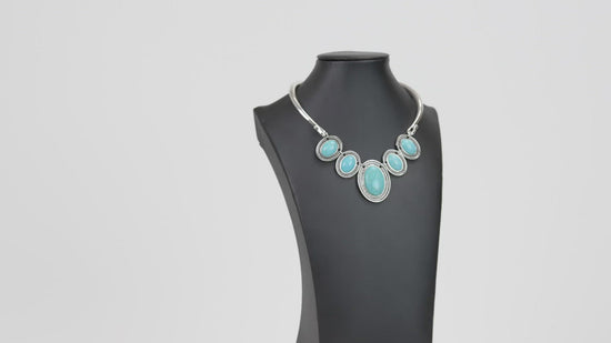Two antiqued silver bars curl around the neck as they give way to a row of refreshing turquoise stones that falls delicately below the collar. Each stone is encased in a textured silver frame, adding a traditional artisanal flair to each unique pendant. Features an adjustable clasp closure.