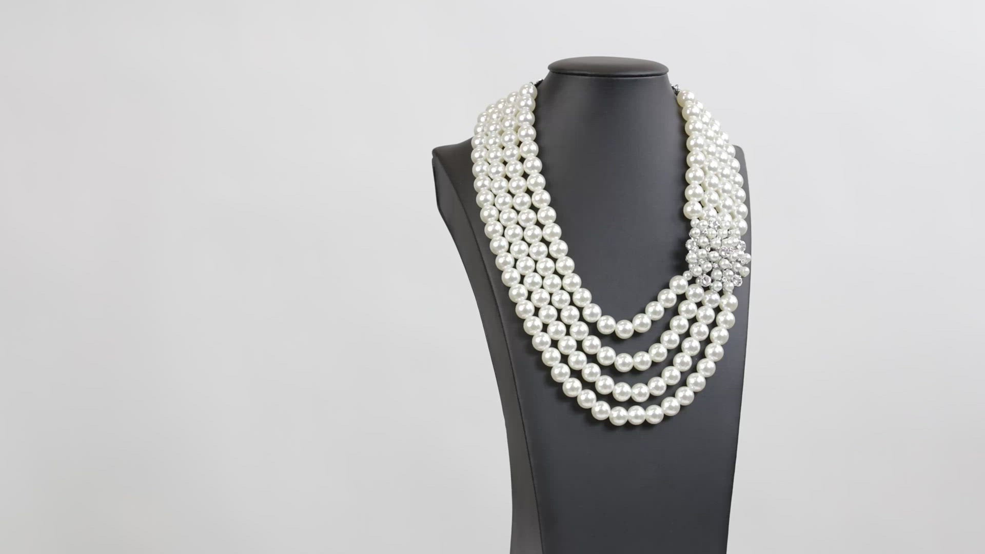 Inspired by royalty, an elegant explosion of classic white rhinestones and timeless pearls delicately coalesces into a vintage brooch. The refined ornament delicately holds together strands of oversized pearls, creating romantically regal layers below the collar. Features an adjustable clasp closure.