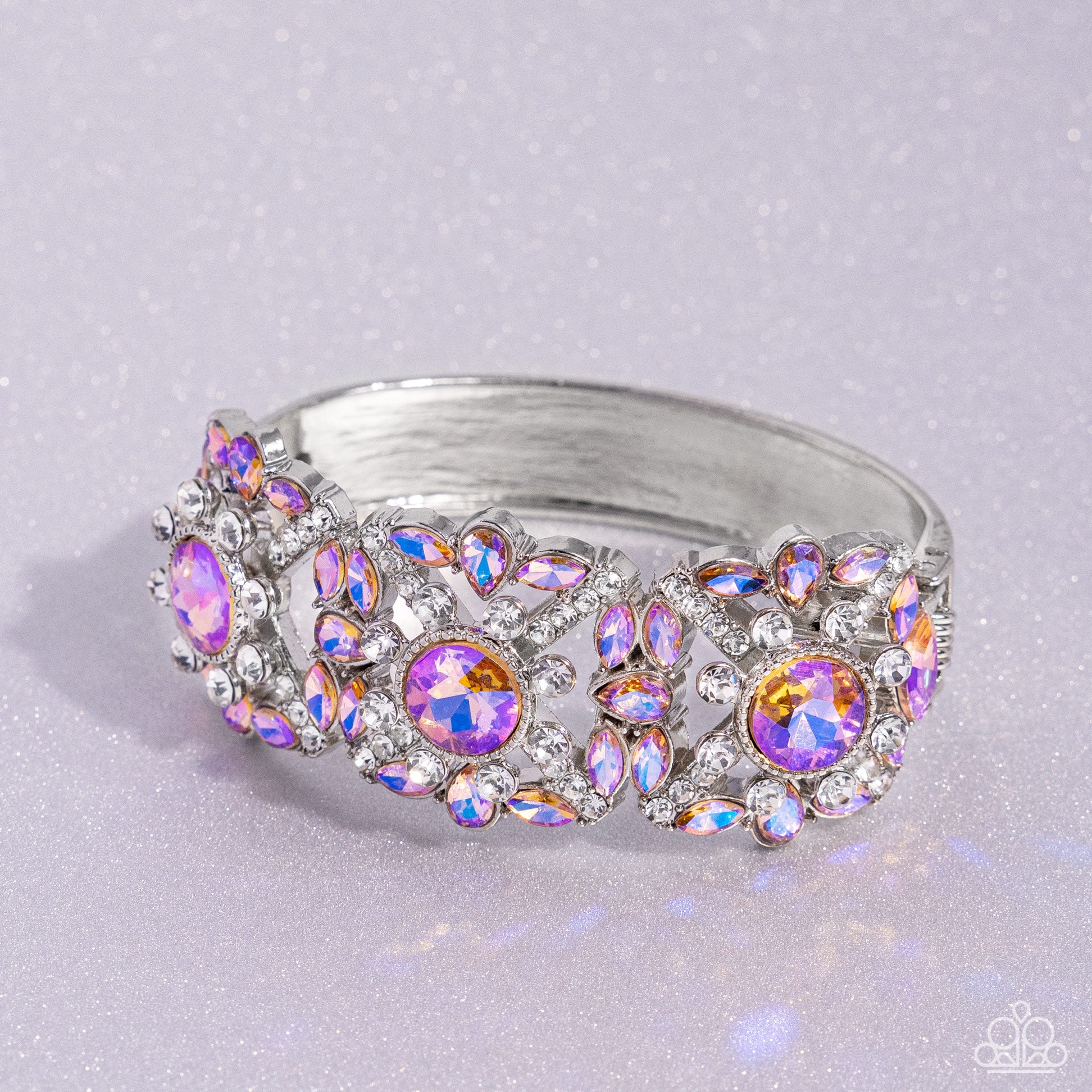 Various orange and white rhinestones in round, teardrop, and marquise cuts sparkle atop airy, silver frames, connected to a silver bangle-like bracelet around the wrist for a jaw-dropping dazzle. Features a hinged closure.