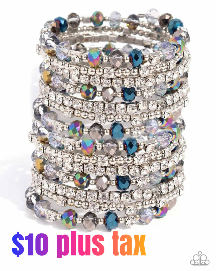 Threaded along a coiled wire, silver beads, white rhinestones in silver square fittings, and oil spill, blue, silver, and transparent faceted beads curl around the wrist, creating an eye-catching, infinity wrap-style bracelet around the wrist.