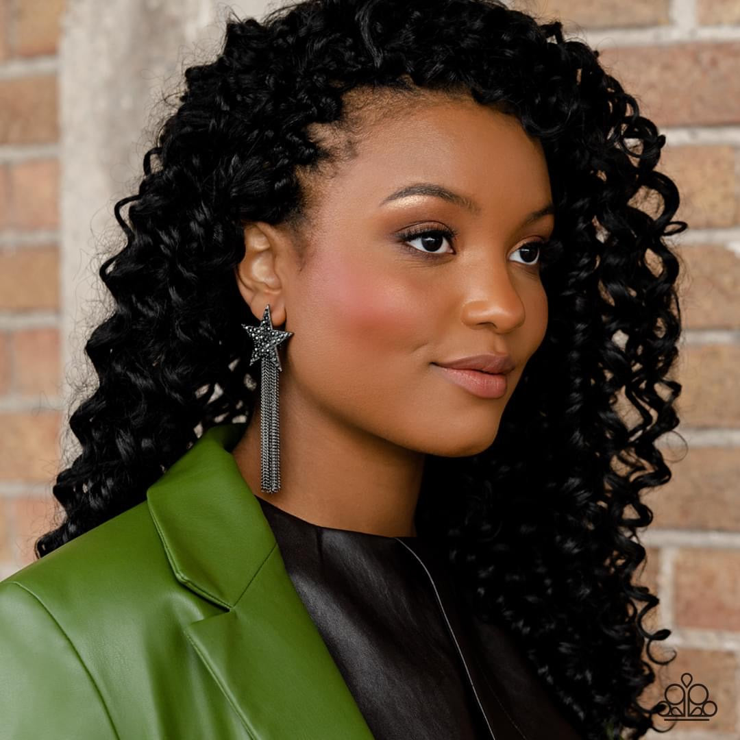 A curtain of gunmetal chains streams out from the bottom of an oversized gunmetal star encrusted in smoky hematite rhinestones, resulting in a stellar tassel. Earring attaches to a standard post fitting.