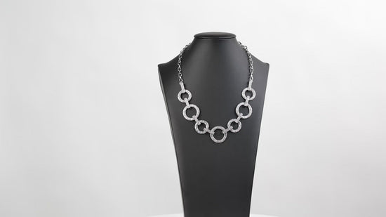 Elegantly enhanced with white rhinestone encrusted links, an effervescent array of white rhinestone encrusted silver hoops glamorously alternate below the collar for an unapologetically audacious sparkle. Features an adjustable clasp closure.