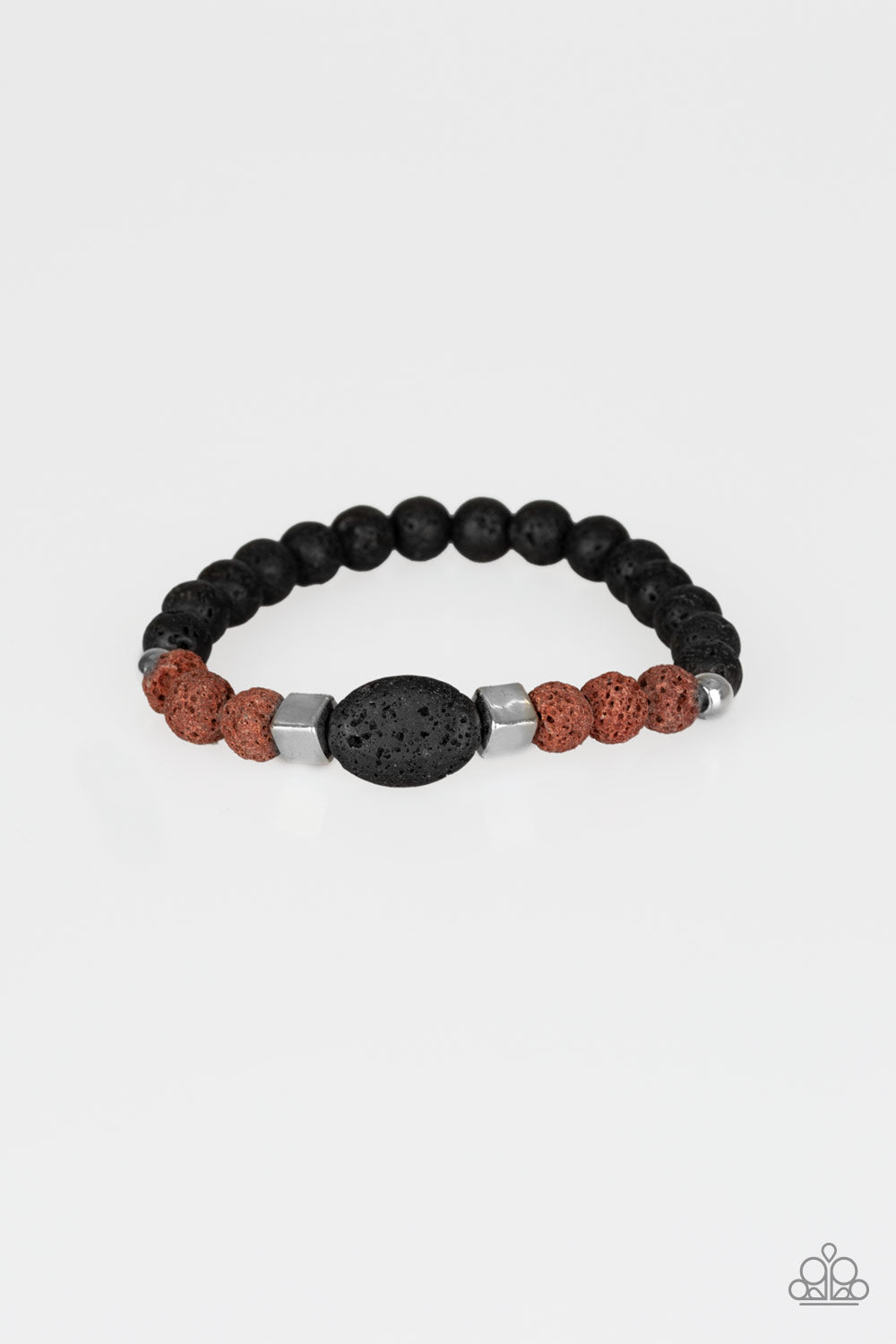 A collection of silver beads, black lava rock, and brown lava rock beads are threaded along a stretchy band around the wrist for a seasonal look.
