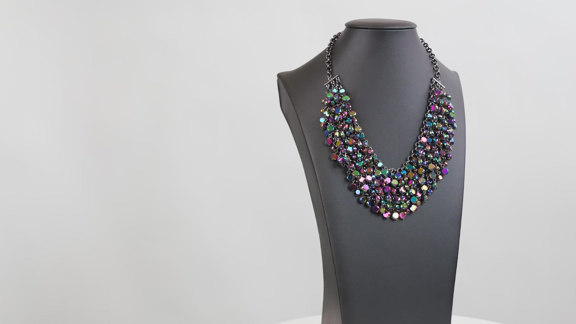 Fiercely faceted oil spill beads flawlessly cascade from row after row of boldly interlocking gunmetal links that connect into an intense metallic netted backdrop. Attached to matching chunky gunmetal chains, the effervescently edgy display noisily swishes back and forth, creating an out-of-this-world fringe below the collar. Features an adjustable clasp closure.